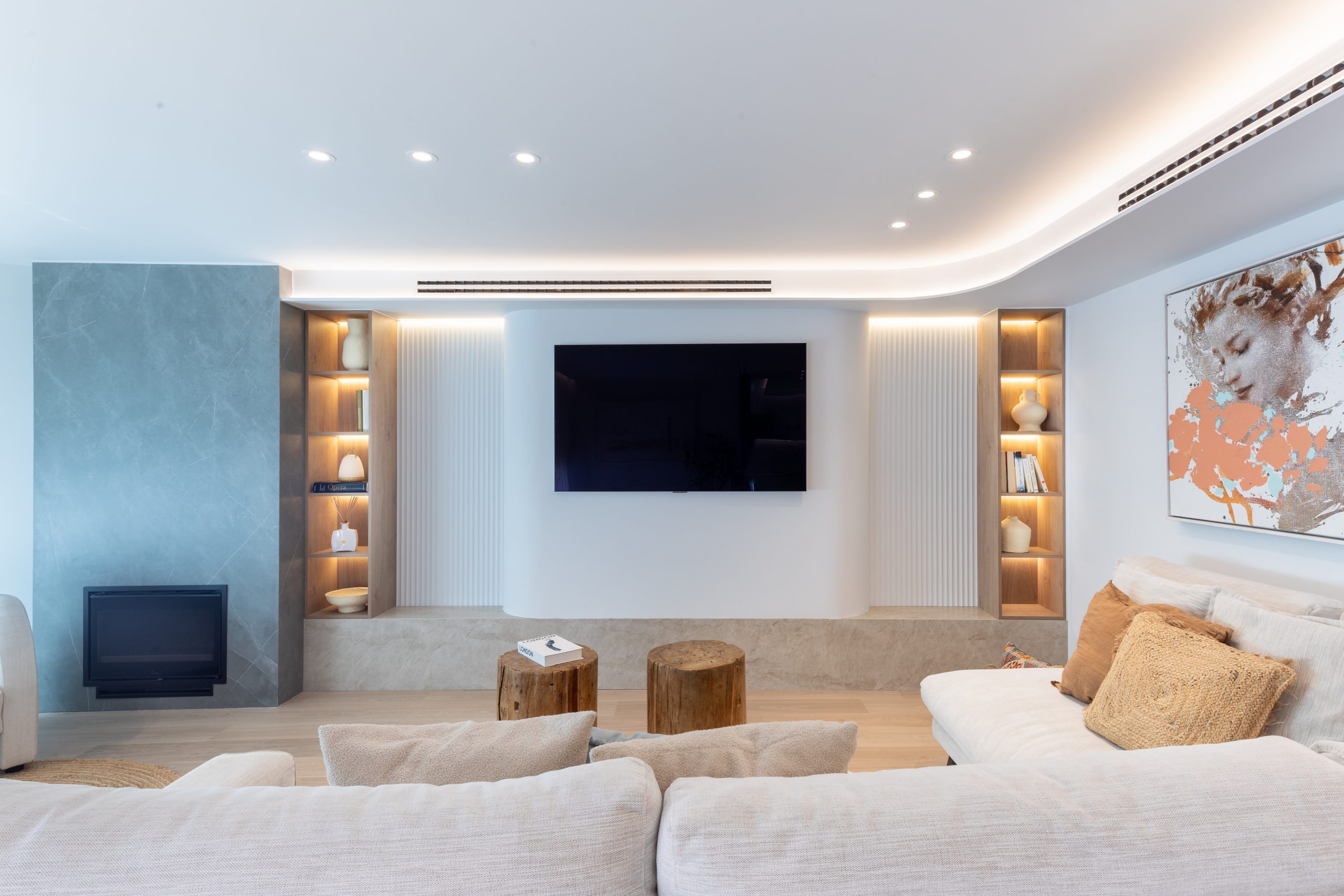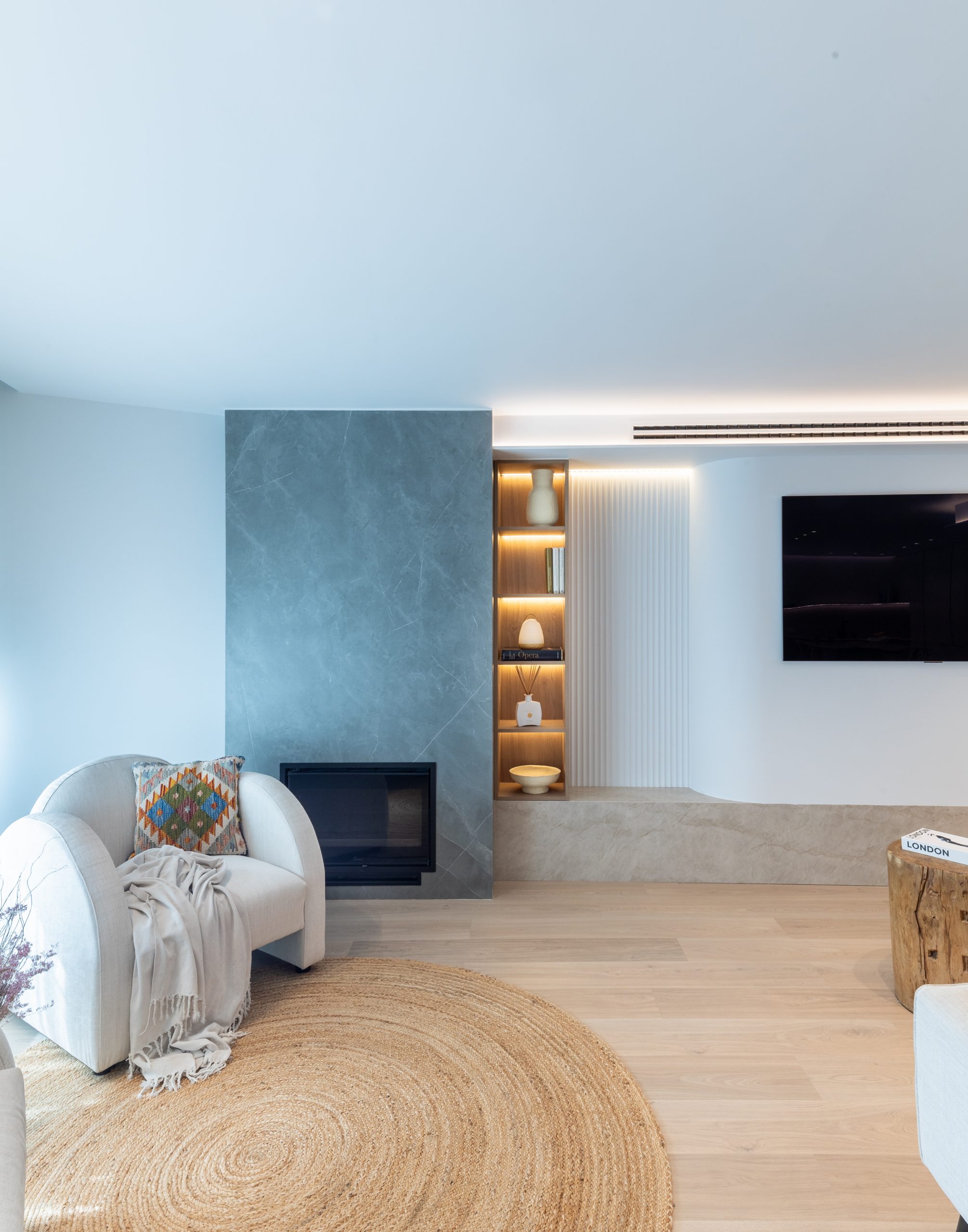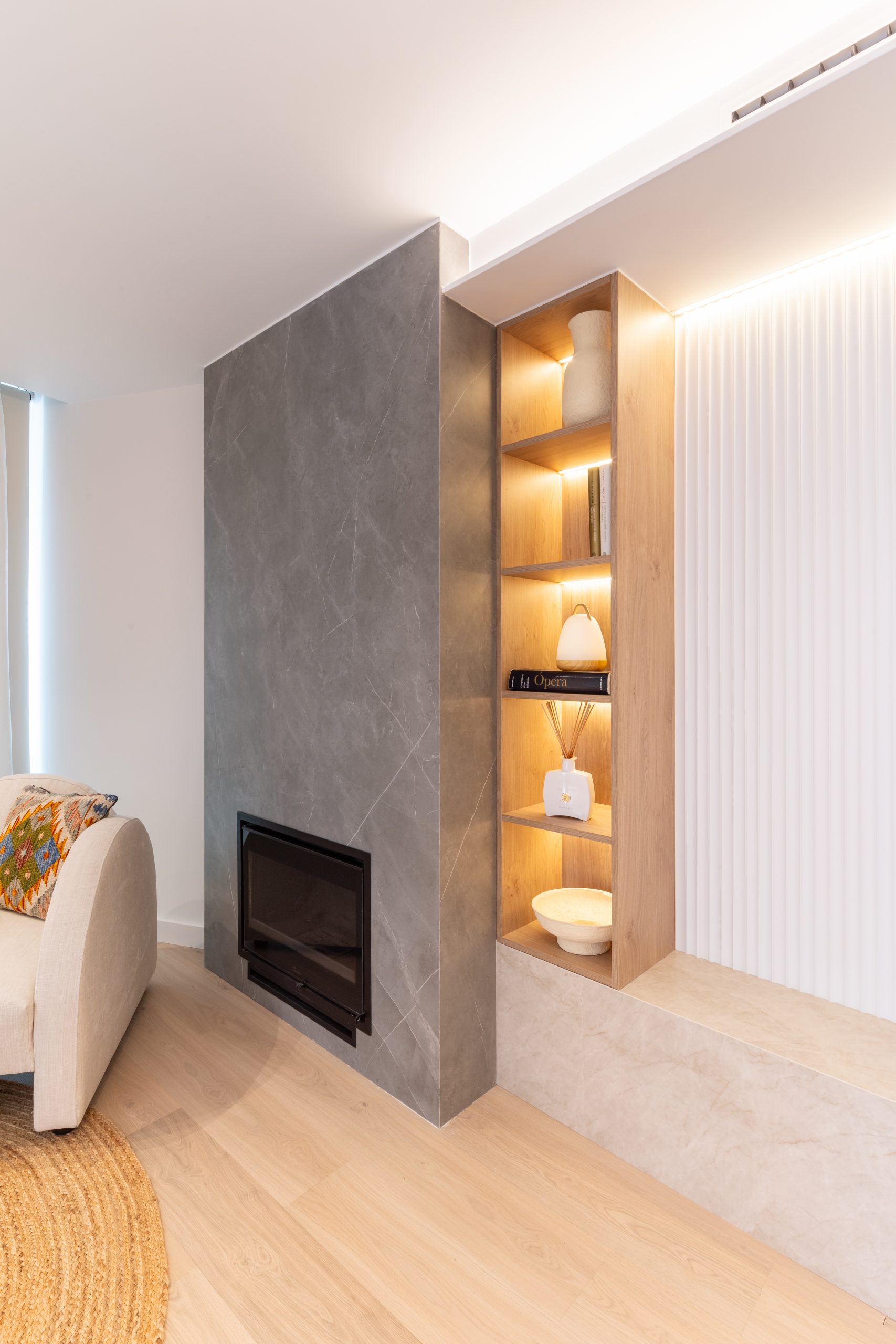Destaca el mueble de TV a medida, con estanterías de madera que aportan calidez, y un revestimiento curvo que le da profundidad. Conservamos la chimenea, pero le damos un toque moderno con un revestimiento de suelo a techo que eleva su estilo.