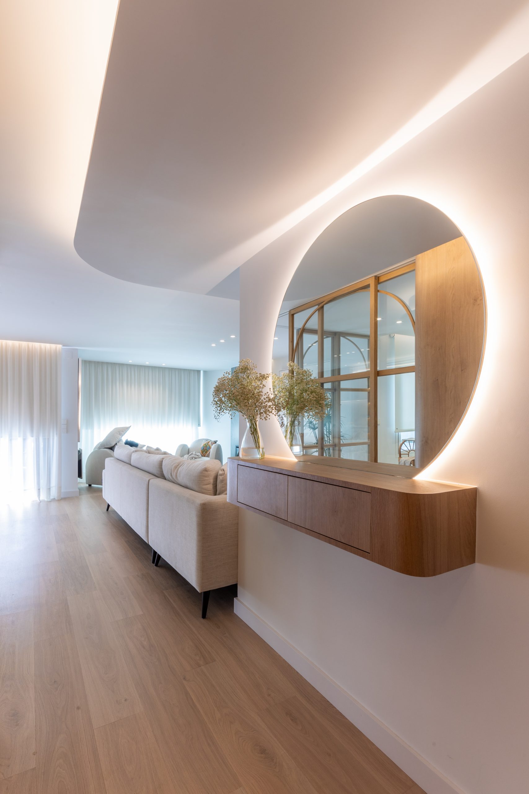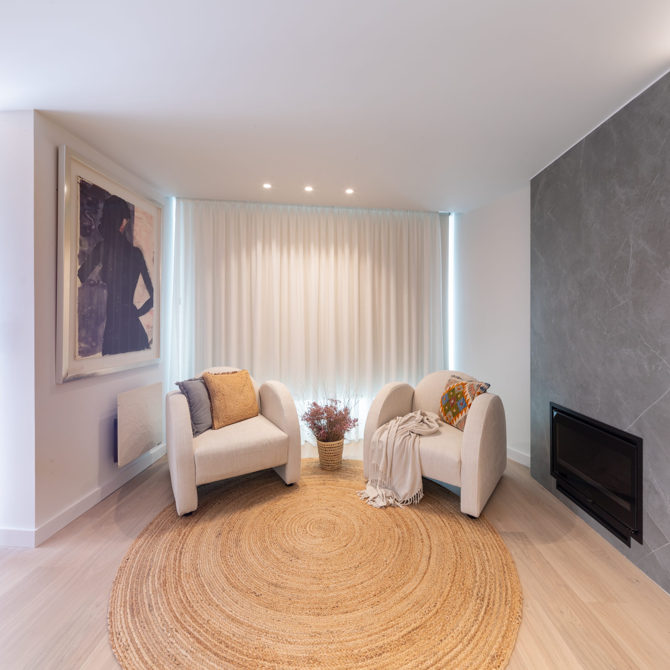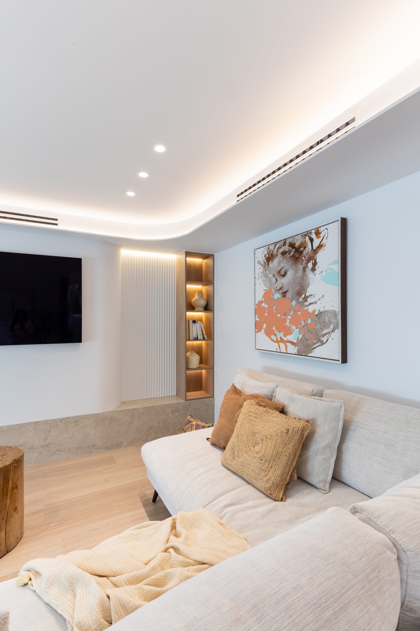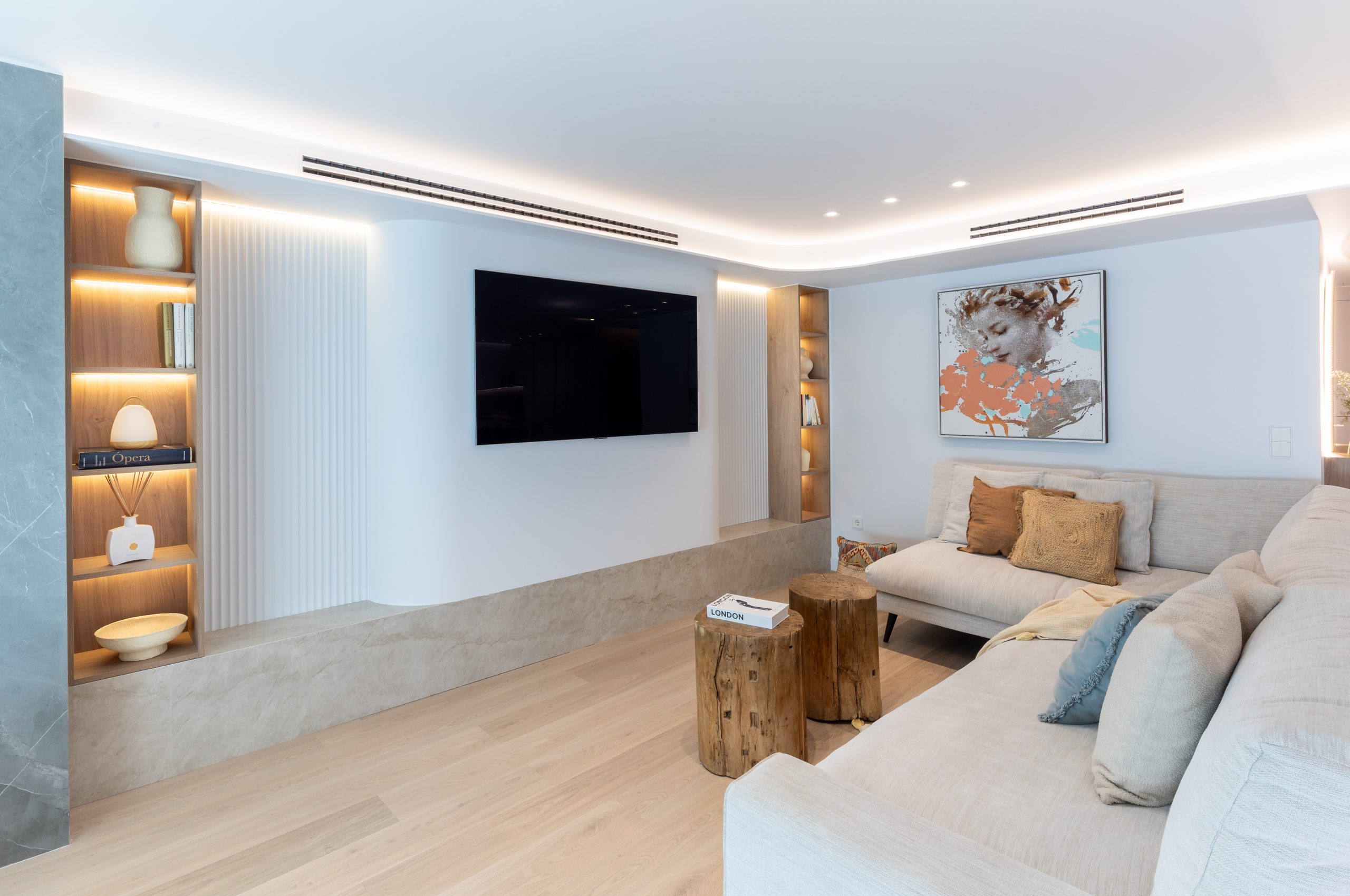 Destaca el mueble de TV a medida, con estanterías de madera que aportan calidez, y un revestimiento curvo que le da profundidad. Conservamos la chimenea, pero le damos un toque moderno con un revestimiento de suelo a techo que eleva su estilo.