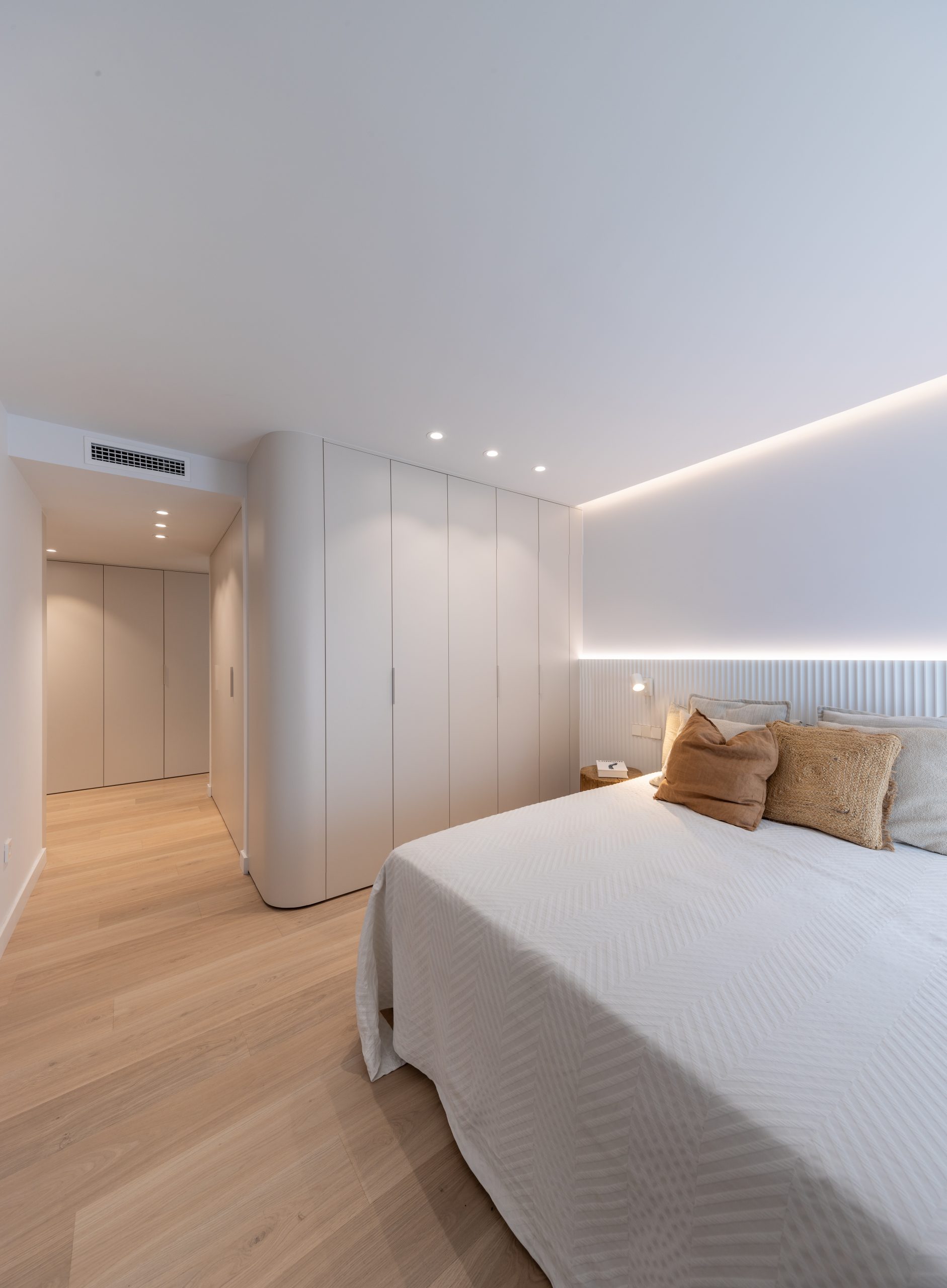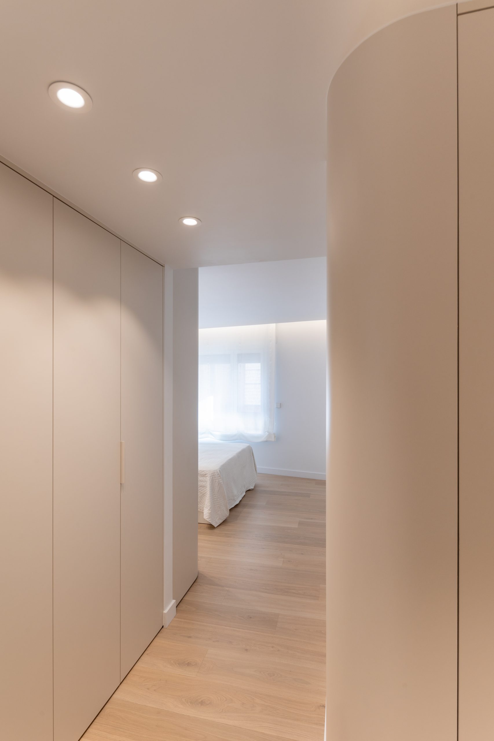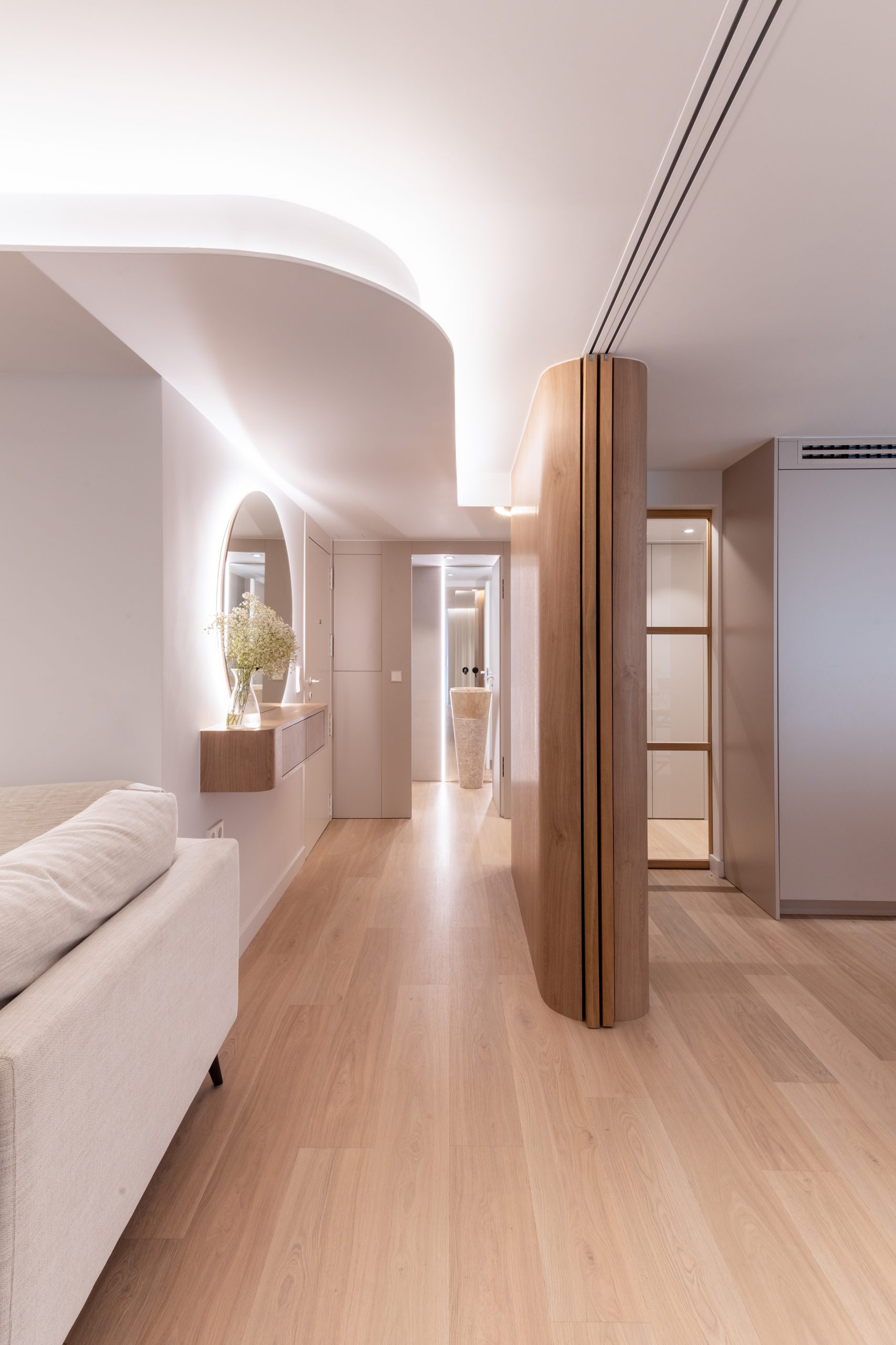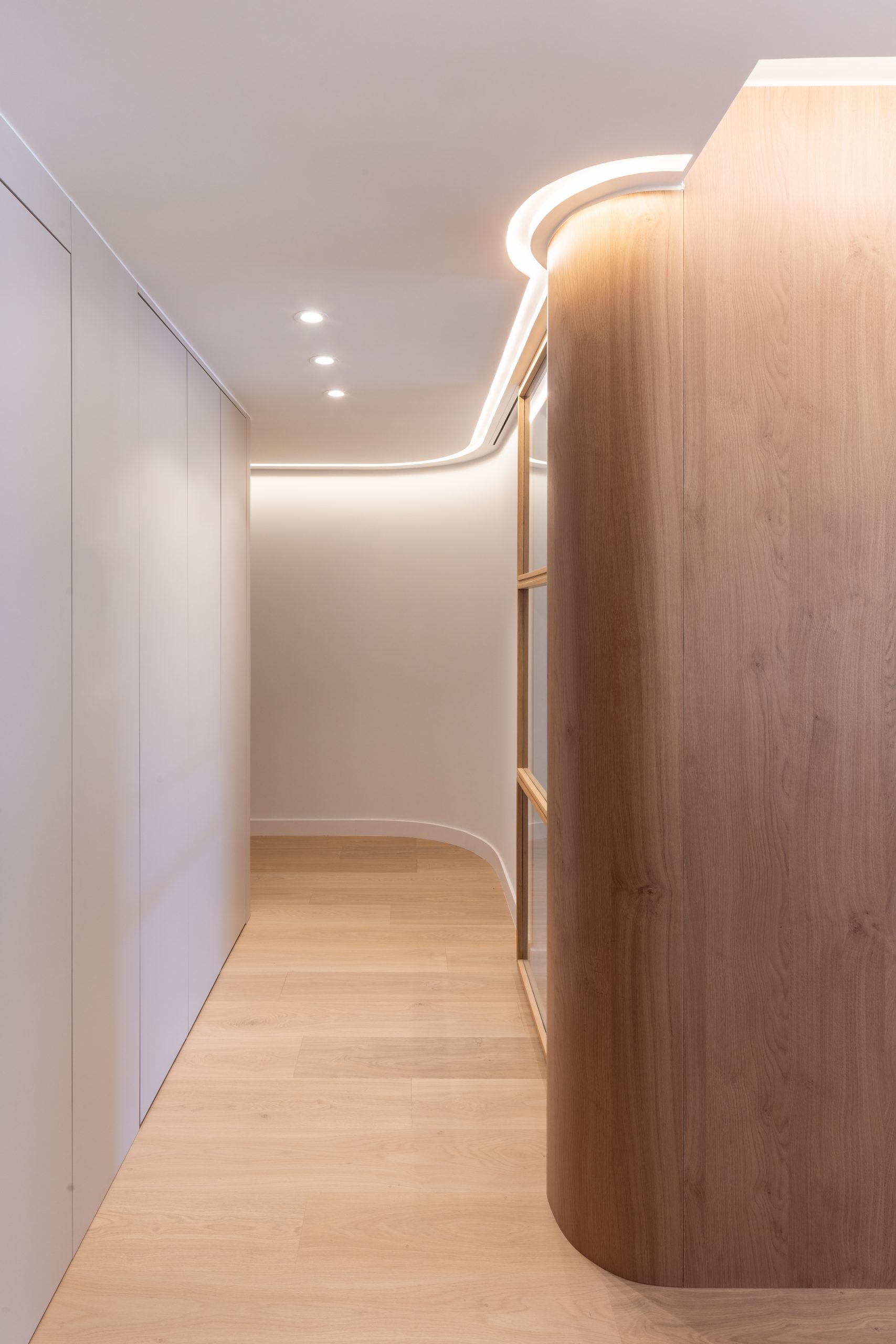 Las curvas están presentes en toda la vivienda, desde los falsos techos que ocultan los conductos del aire y aportan un toque distintivo, hasta las paredes y armarios.