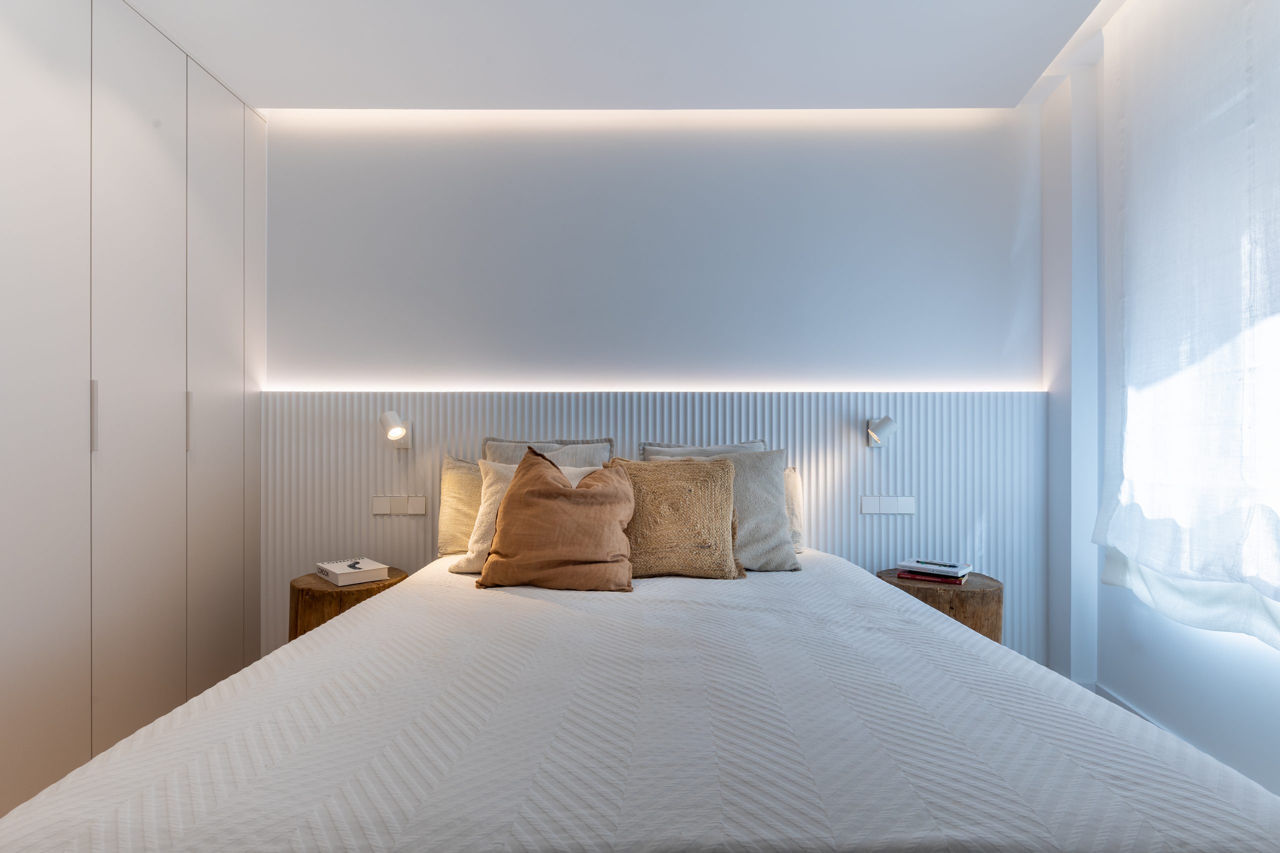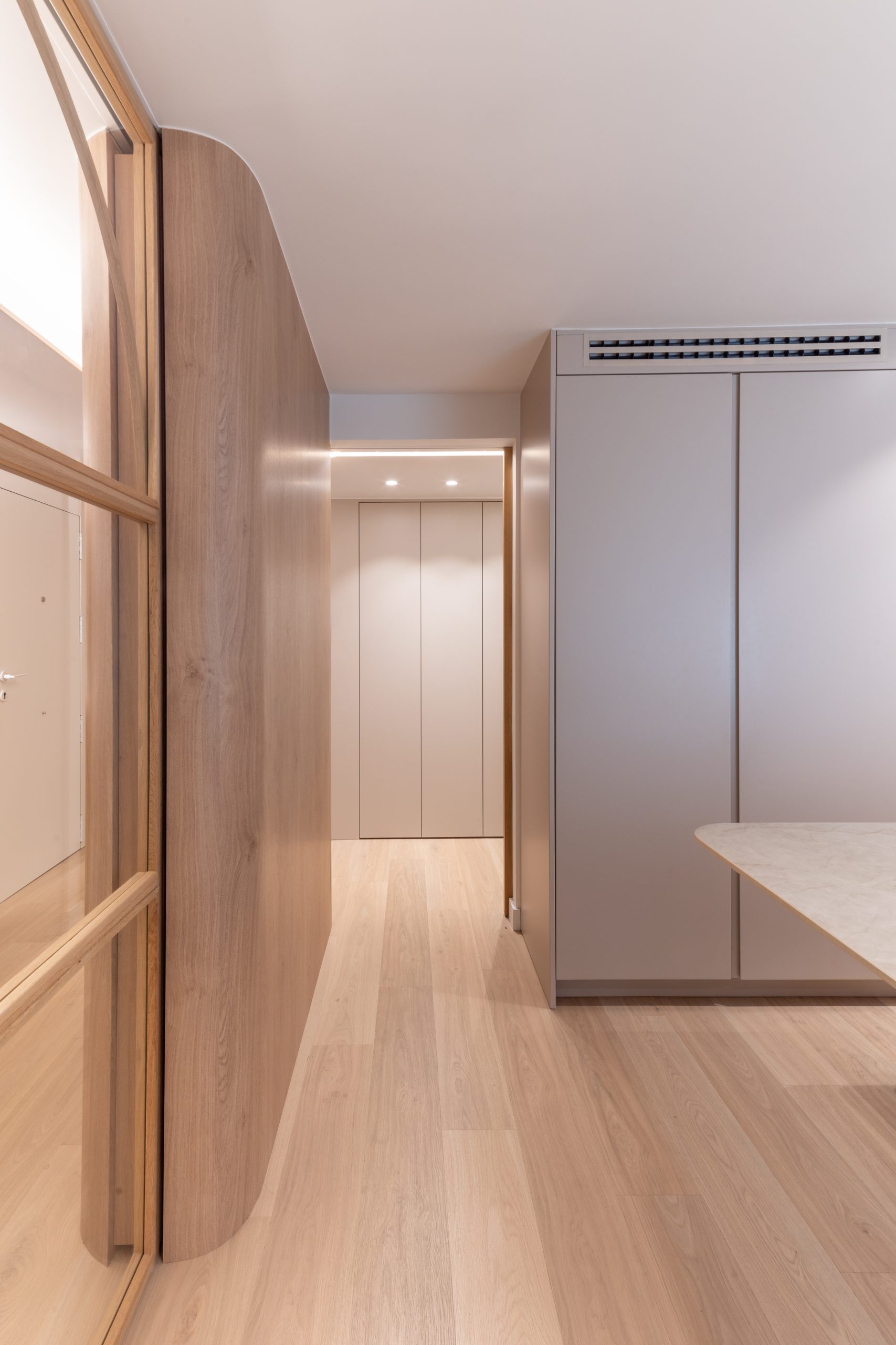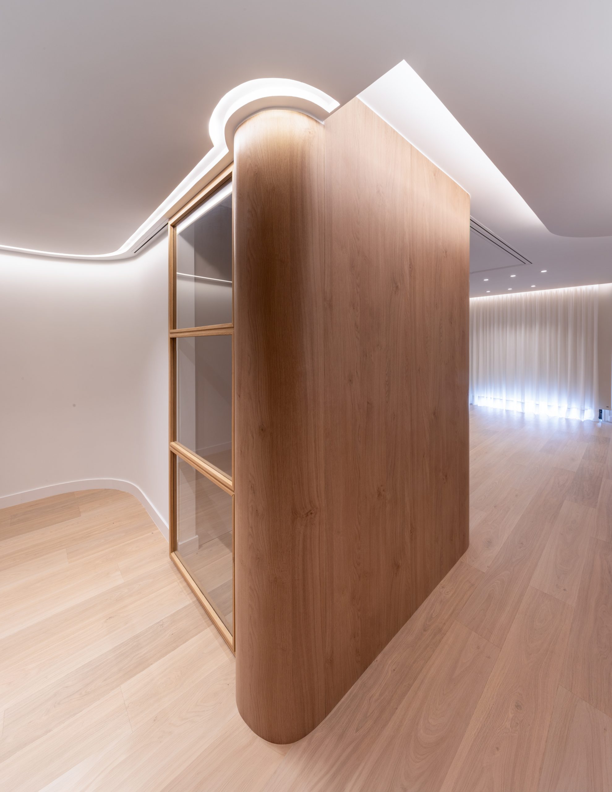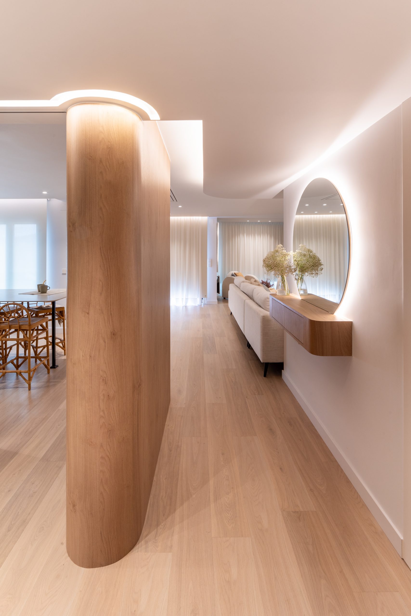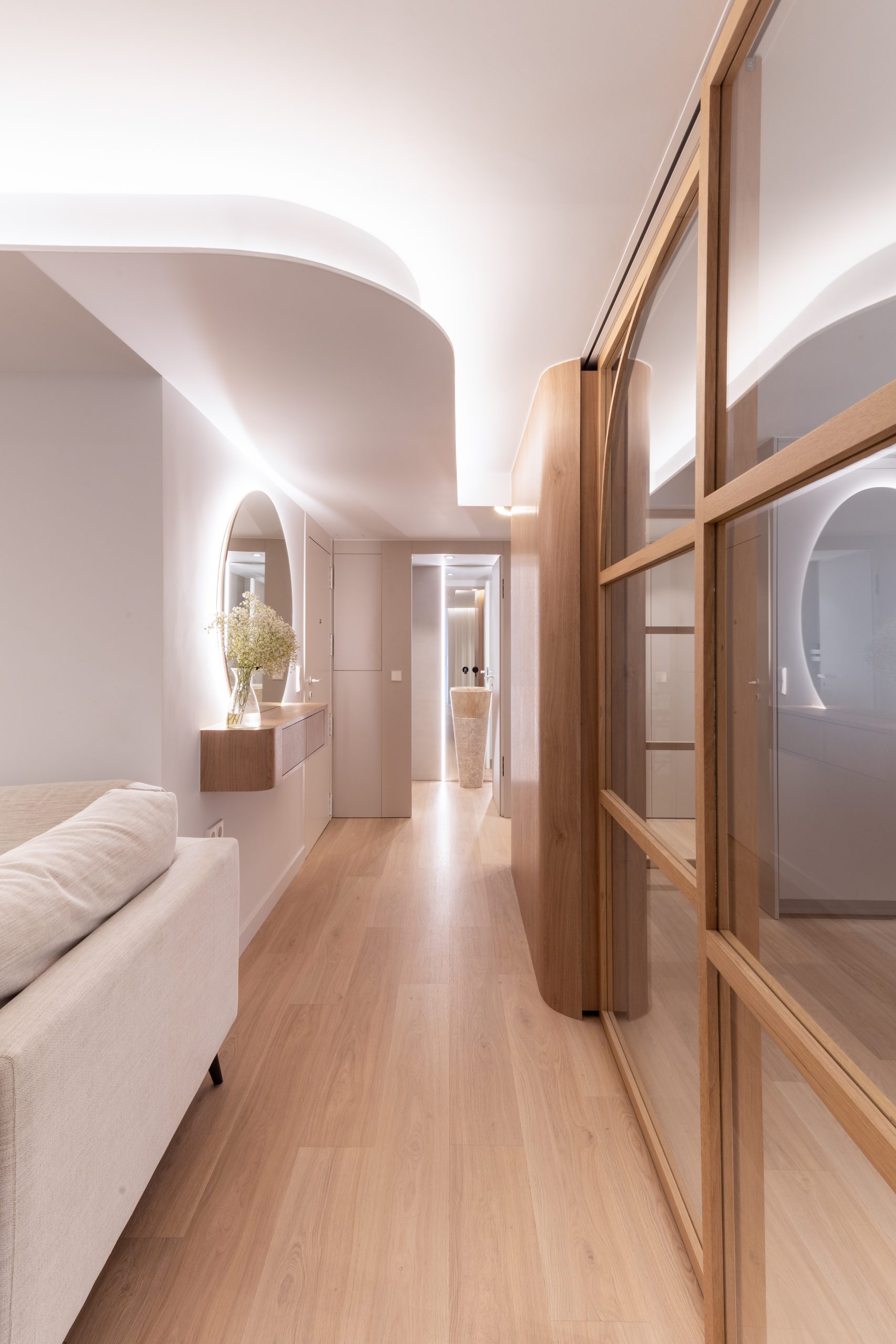 Las curvas están presentes en toda la vivienda, desde los falsos techos que ocultan los conductos del aire y aportan un toque distintivo, hasta las paredes y armarios.