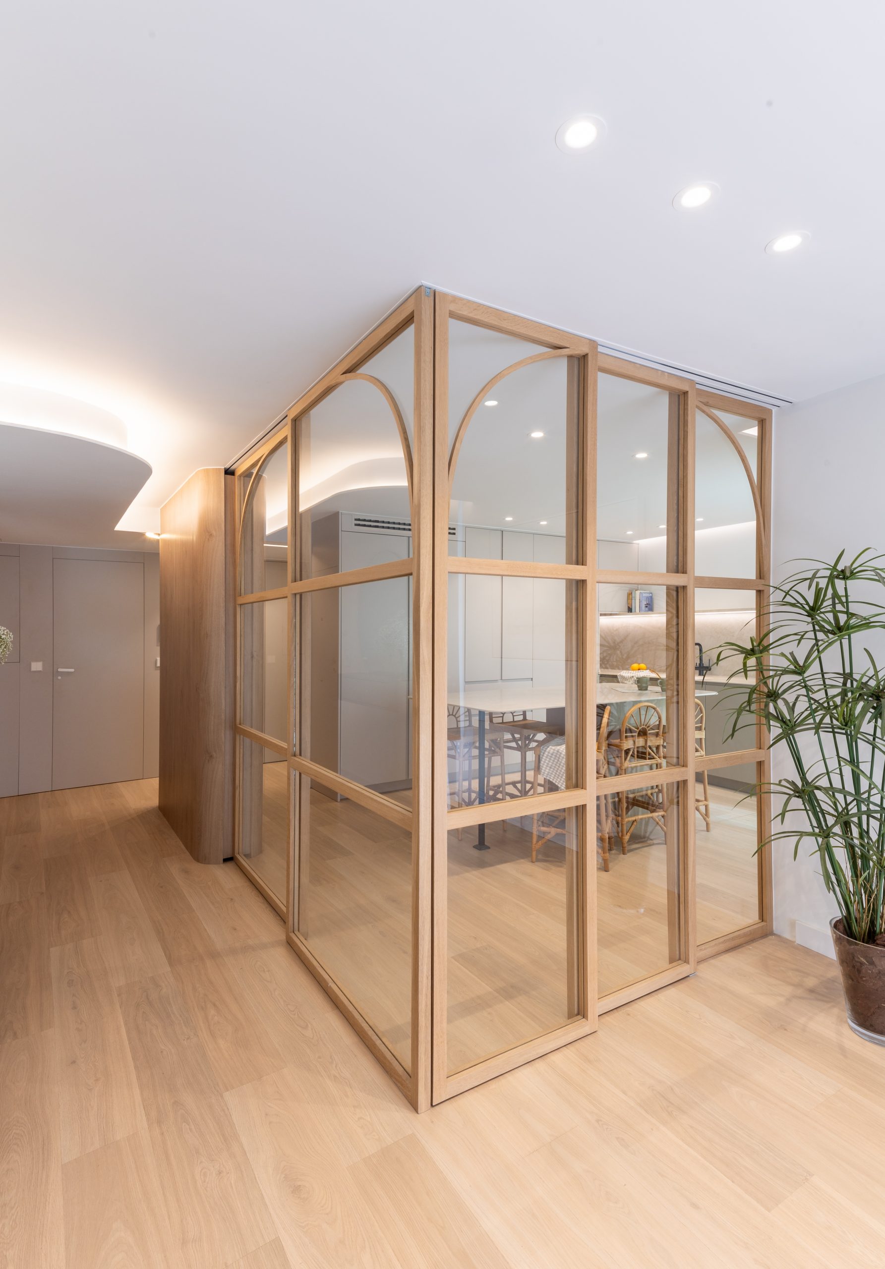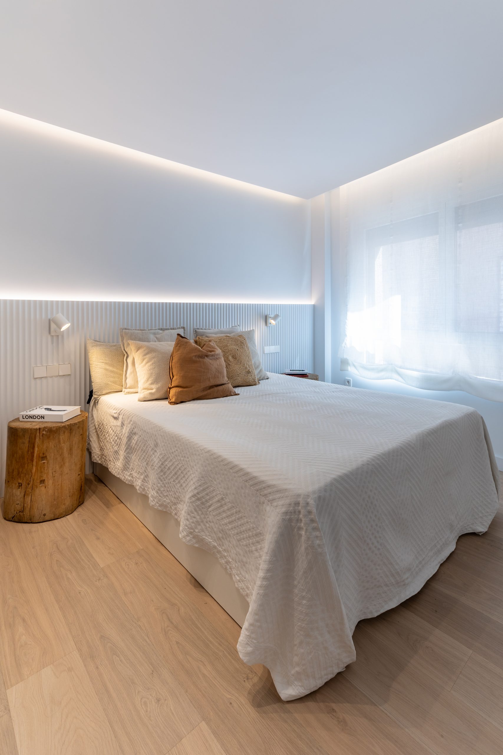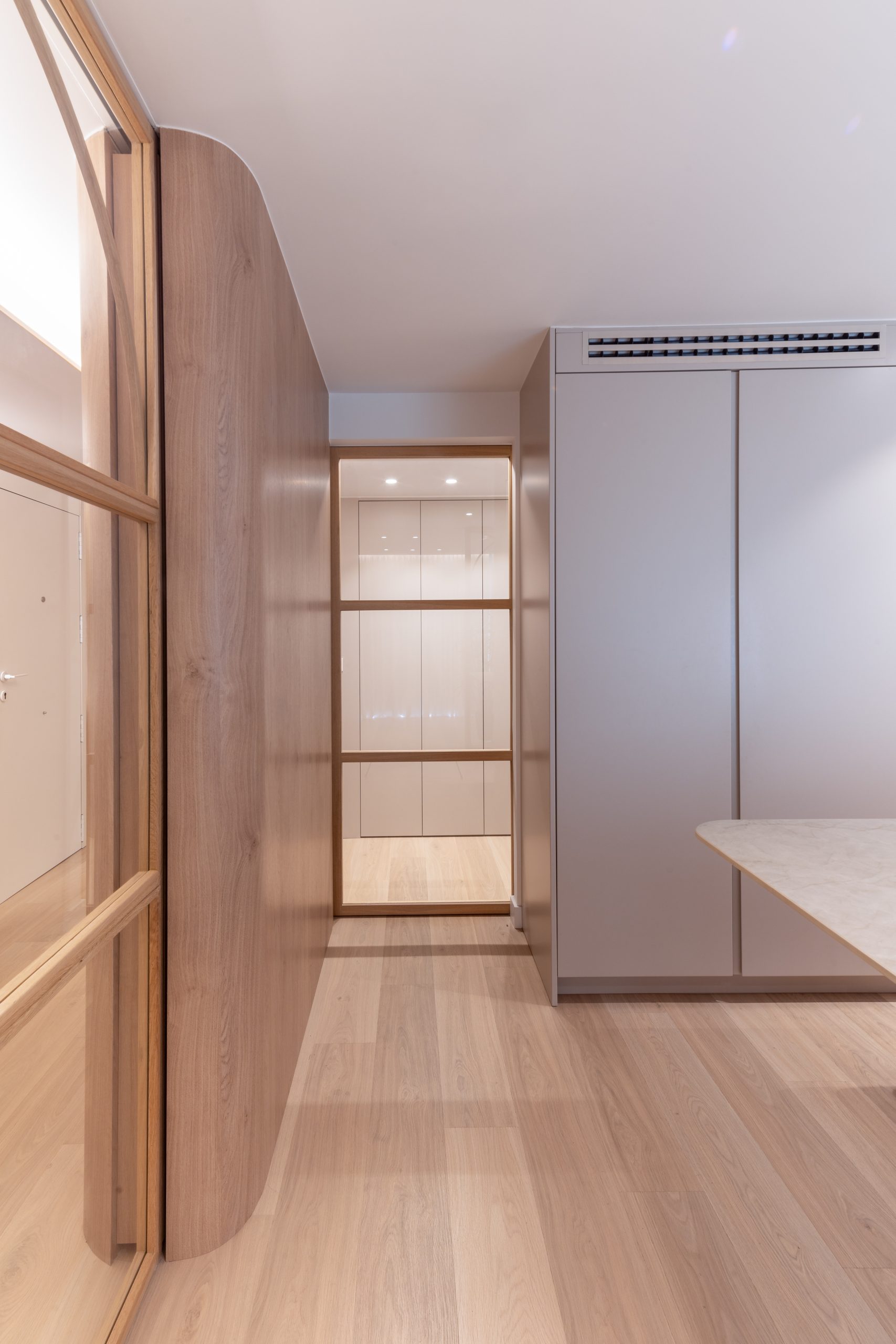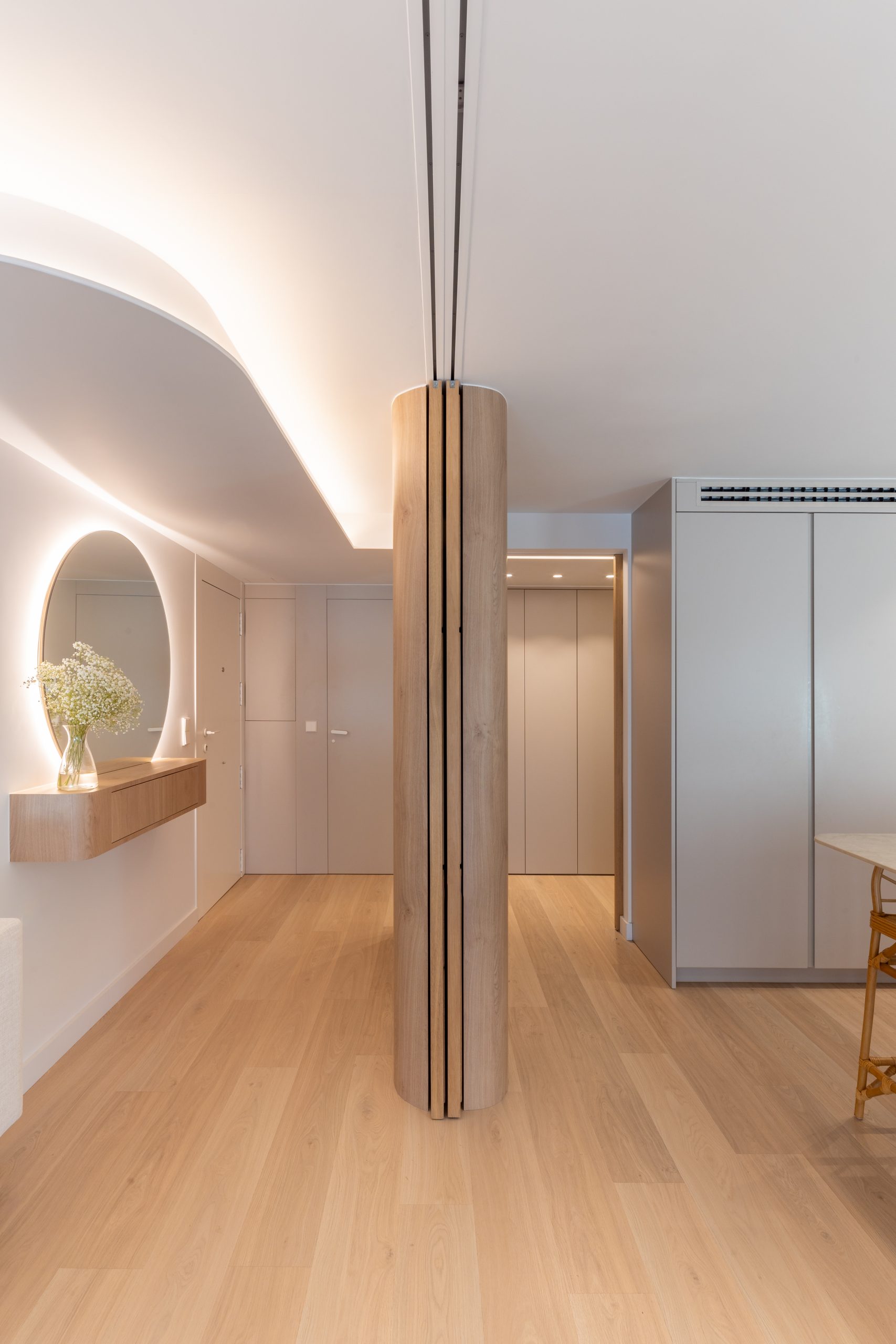 Las curvas están presentes en toda la vivienda, desde los falsos techos que ocultan los conductos del aire y aportan un toque distintivo, hasta las paredes y armarios.