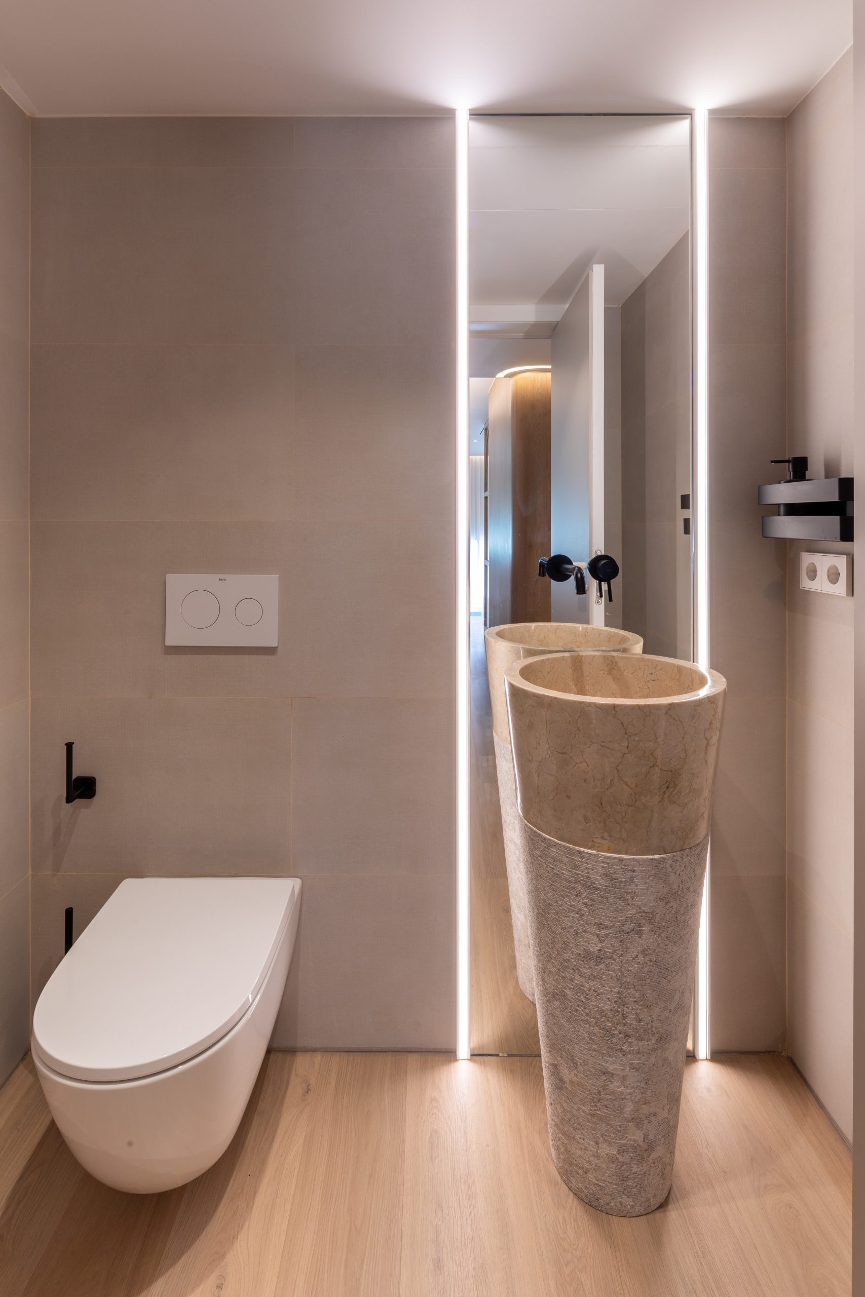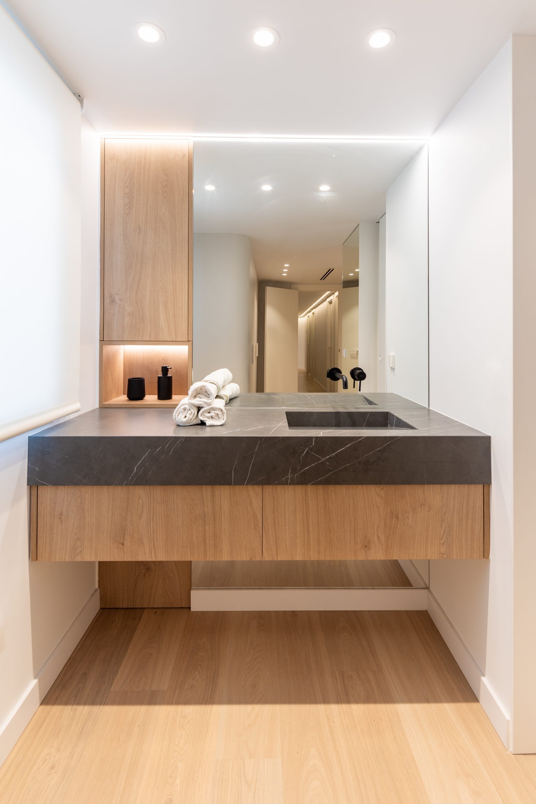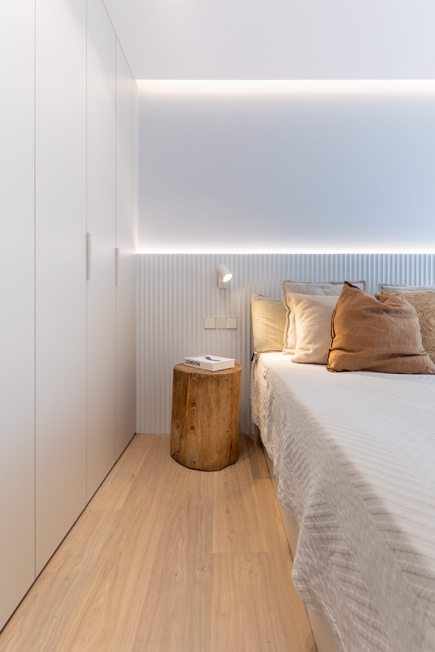 Para finalizar, llegamos al dormitorio principal, con una cantidad de almacenaje increíble. El lavabo es una pieza de diseño que queda a la vista, mientras que el wc y la ducha están ocultos tras una puerta corredera para mantener el estilo limpio y elegante. Y el cabecero del dormitorio tiene el mismo revestimiento que en el salón, creando continuidad en todo el hogar