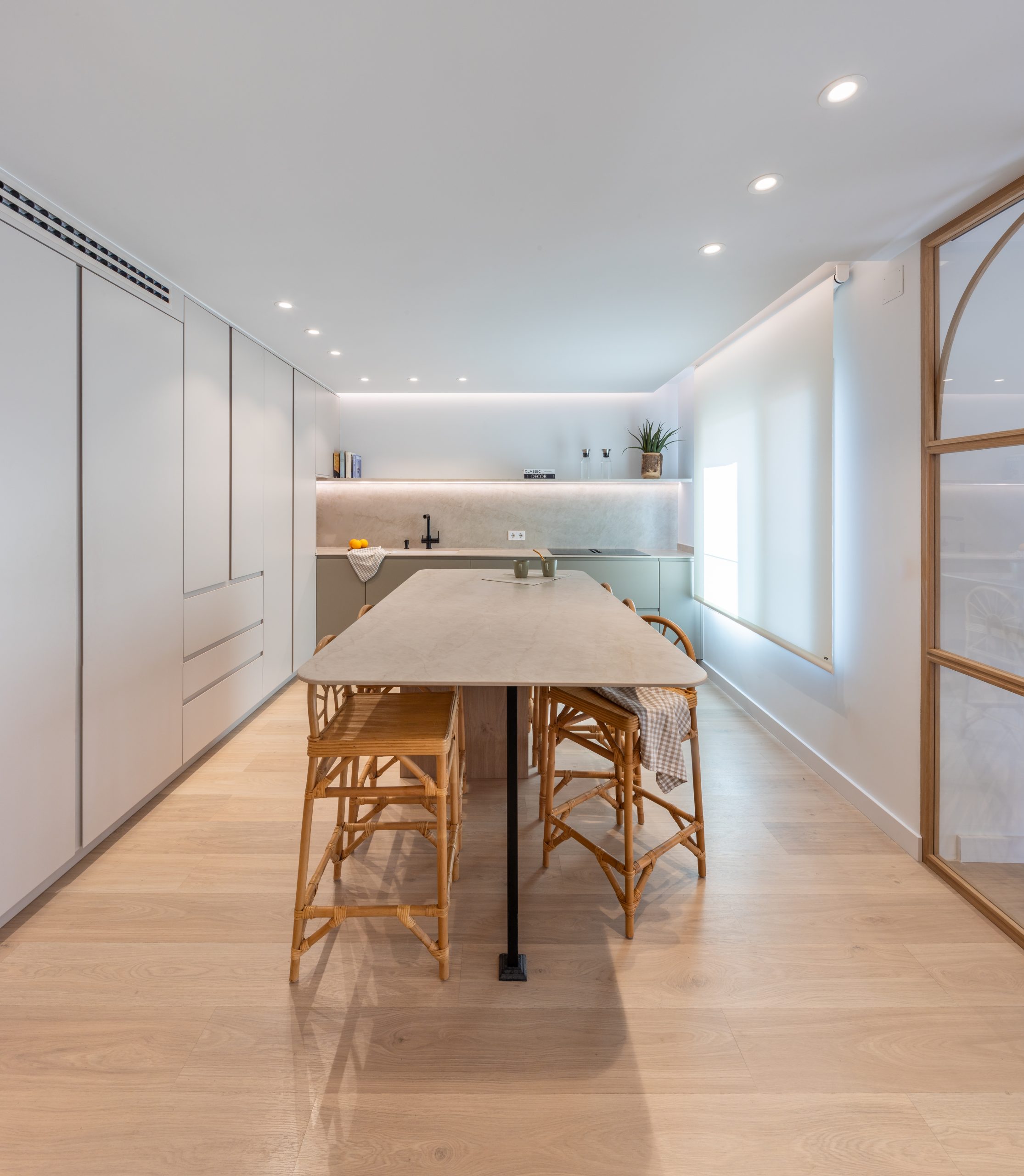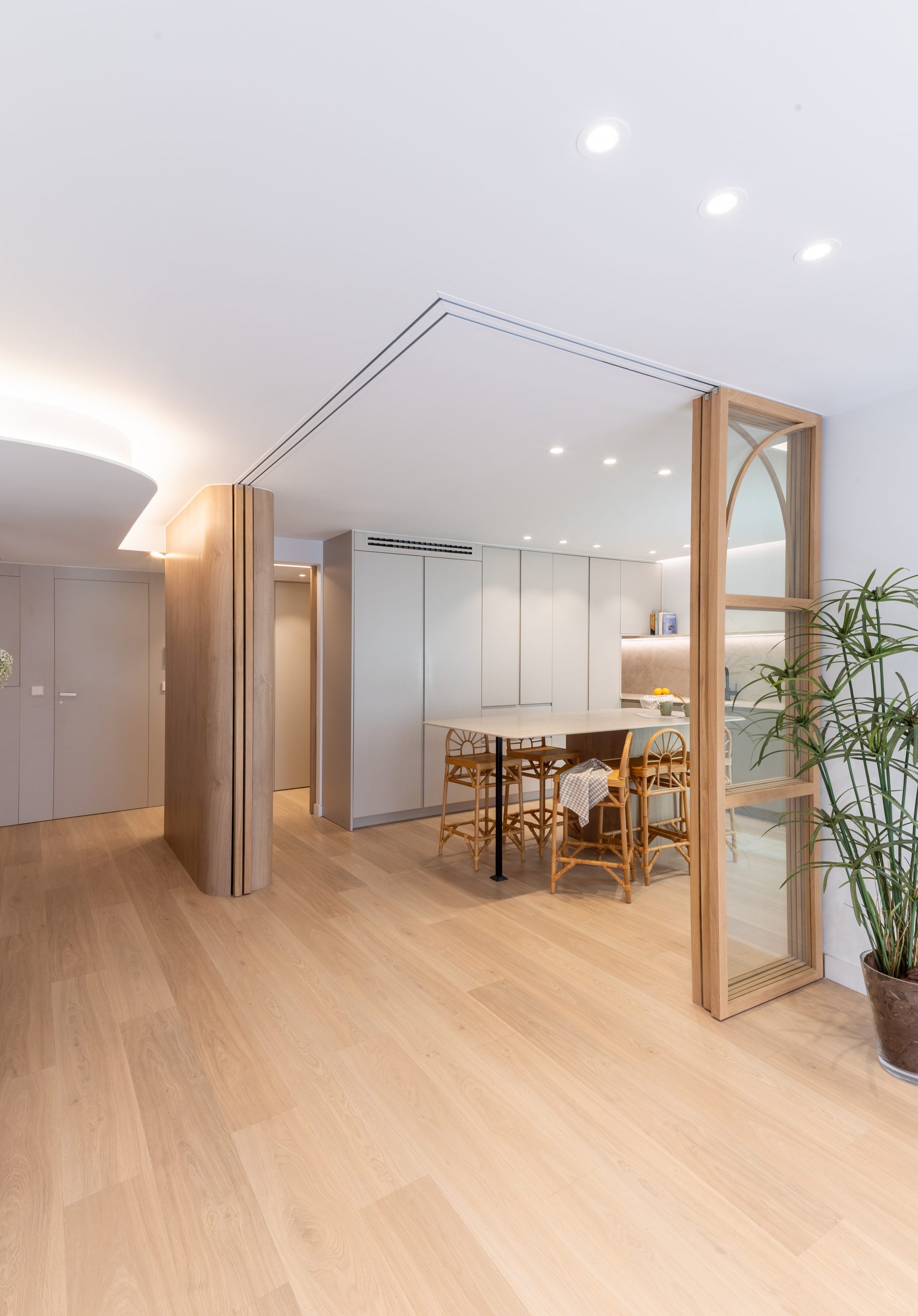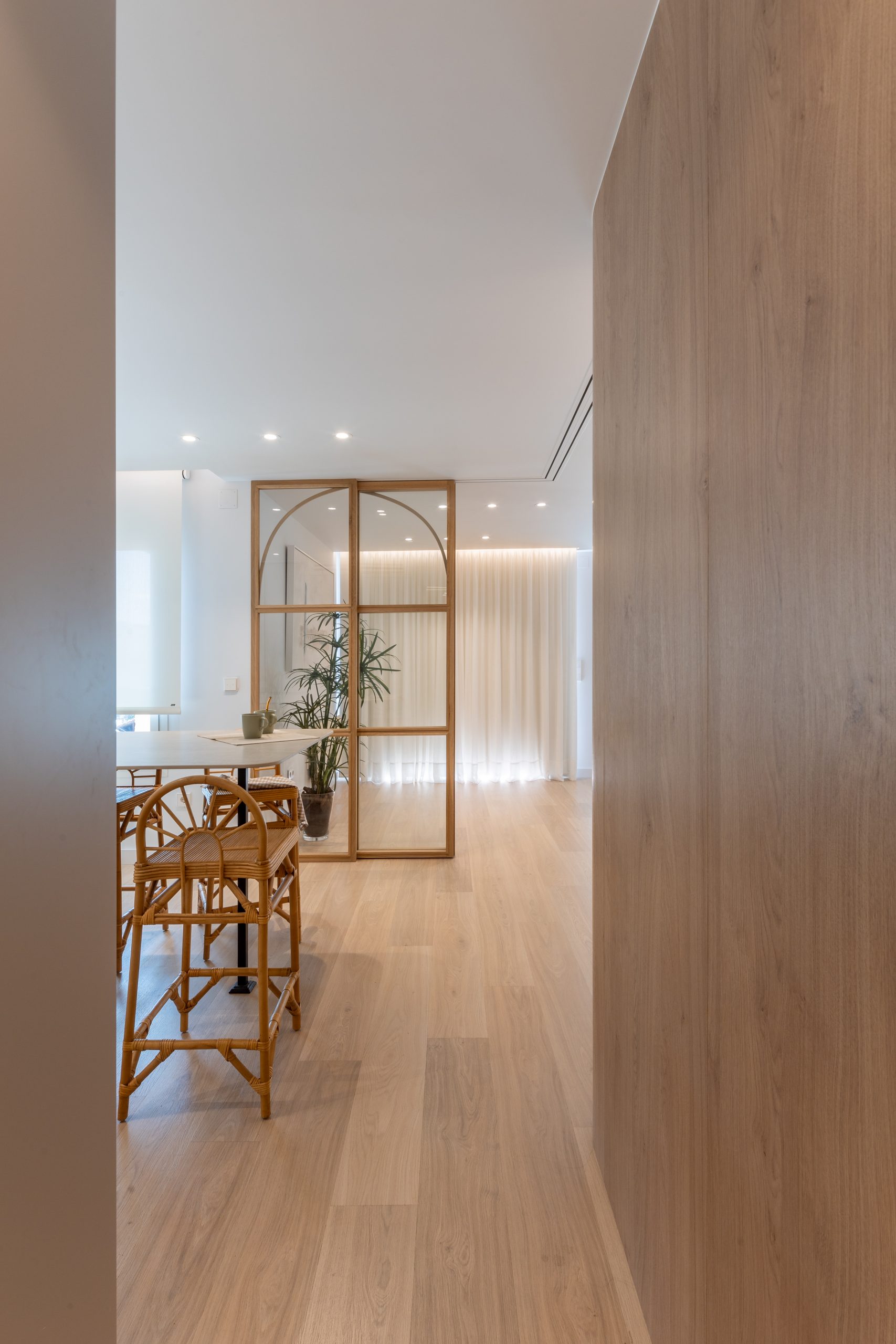 Donde antes teníamos una cocina oscura dando al patio de luces, ahora tenemos una zona de día amplia y luminosa, conectando salón y cocina pero añadiéndoles puertas correderas en madera natural.