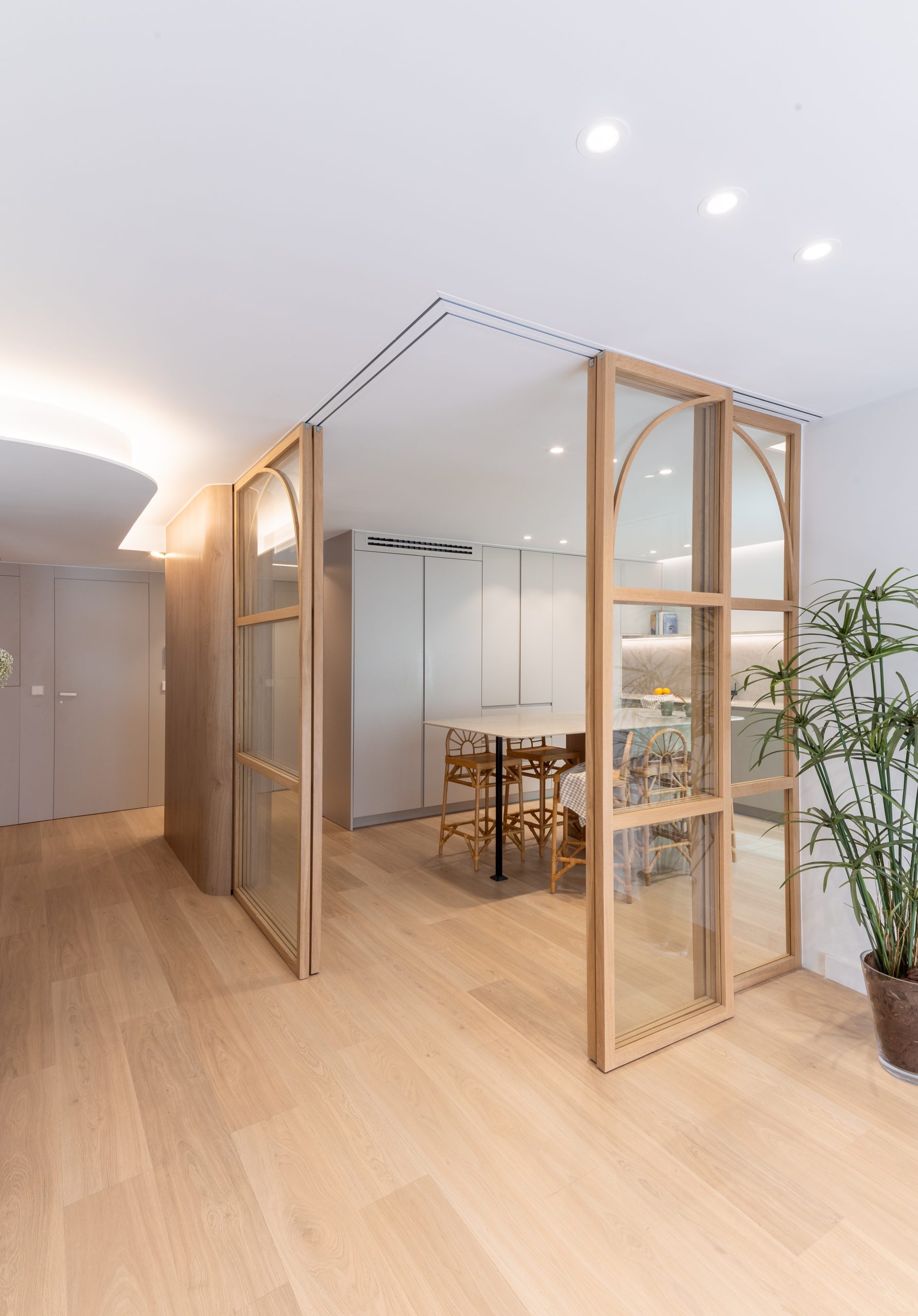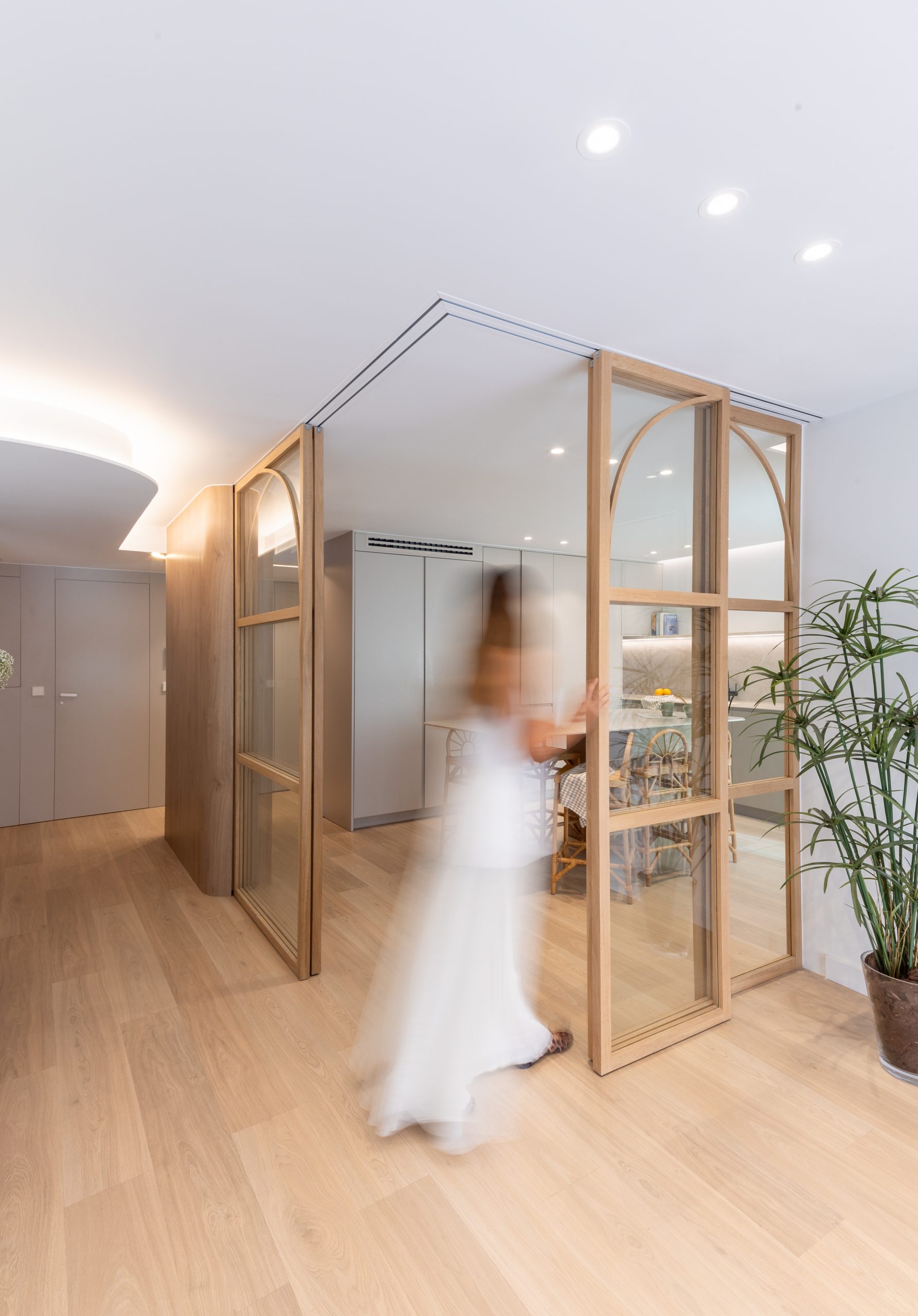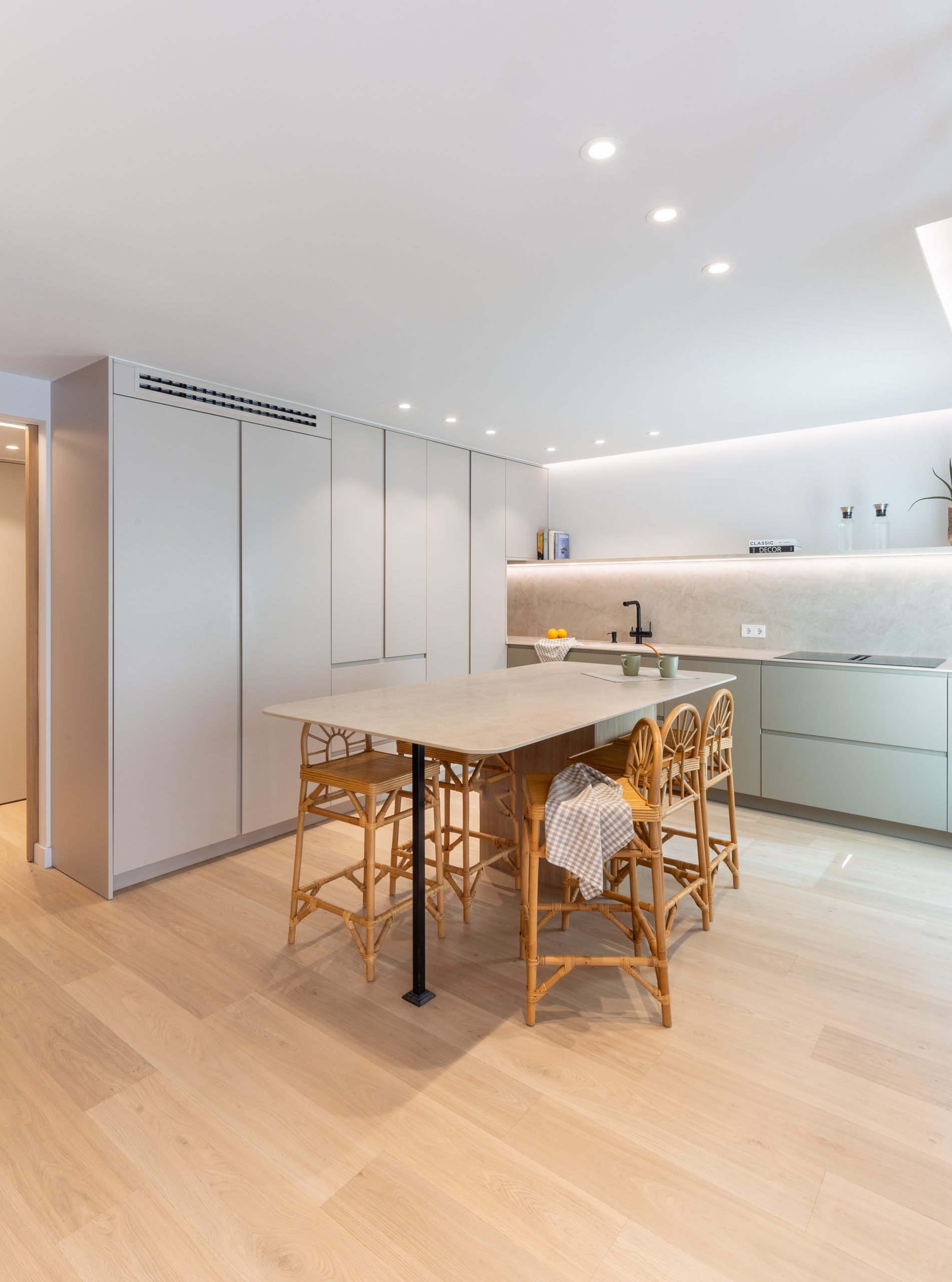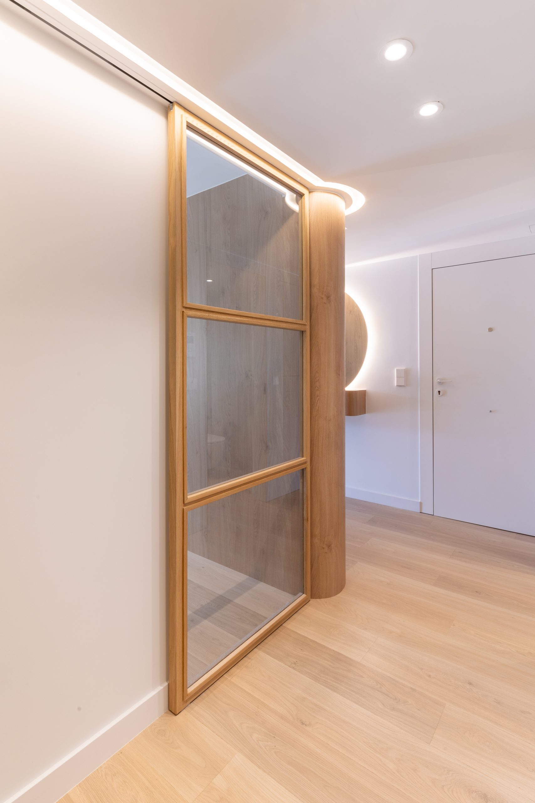Donde antes teníamos una cocina oscura dando al patio de luces, ahora tenemos una zona de día amplia y luminosa, conectando salón y cocina pero añadiéndoles puertas correderas en madera natural.