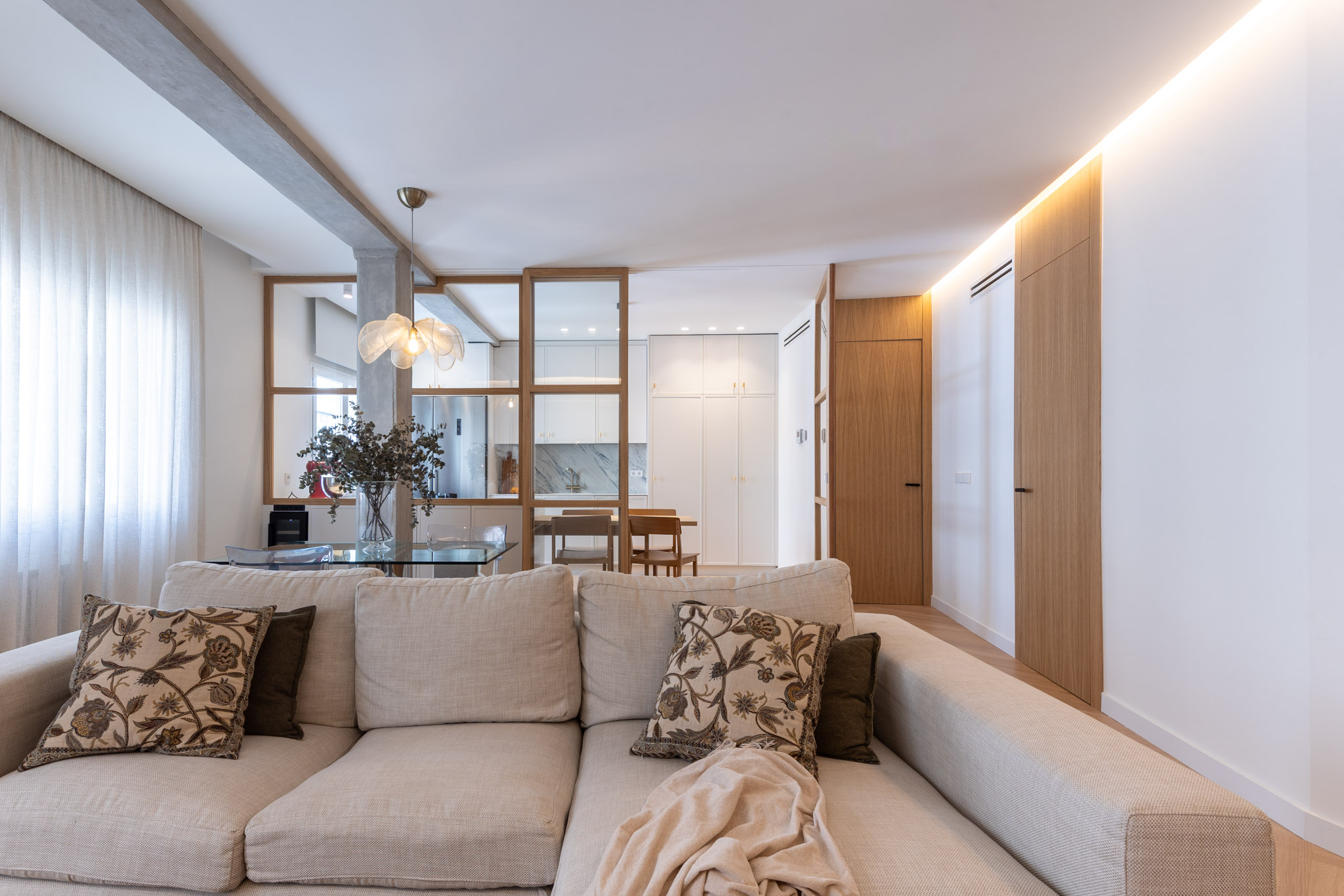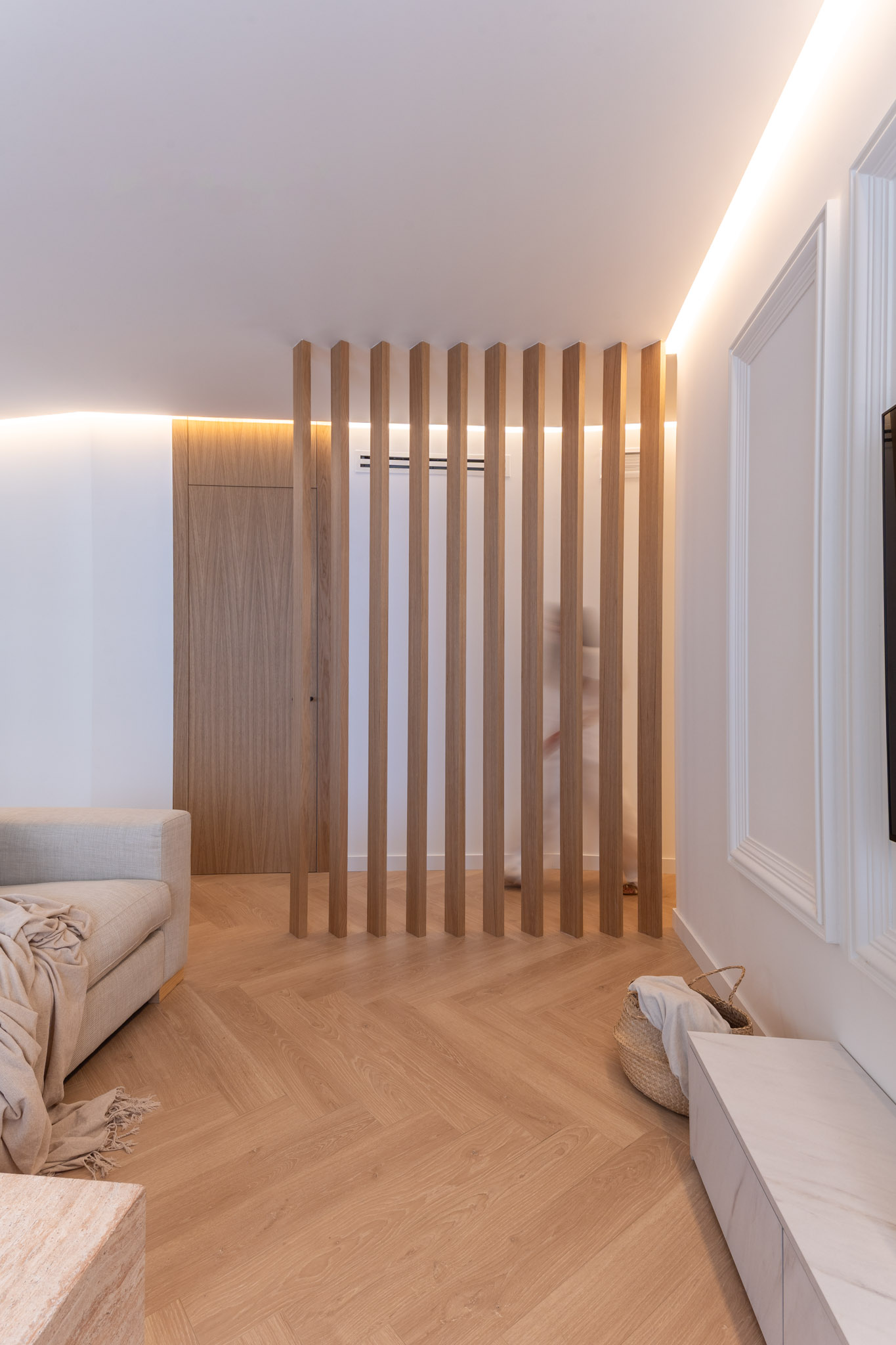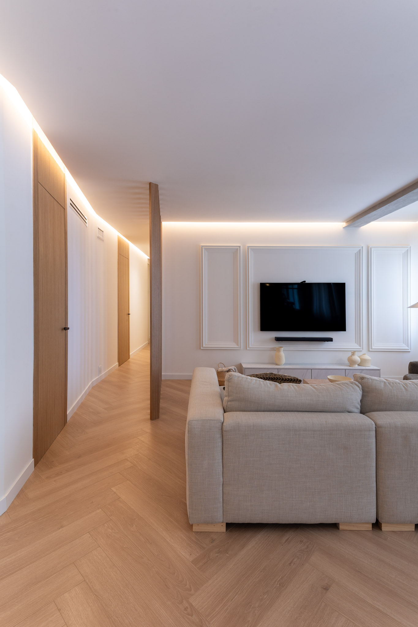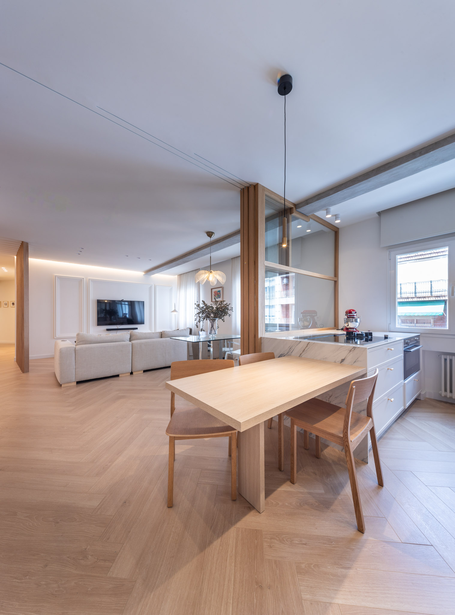 Además, se diseñaron soluciones de almacenaje a medida en diferentes estancias, multiplicando la capacidad de organización sin sacrificar amplitud ni estética.El resultado es un hogar funcional y versátil, donde cada miembro de la familia encuentra su propio espacio, y al mismo tiempo se disfrutan áreas comunes amplias y conectadas.